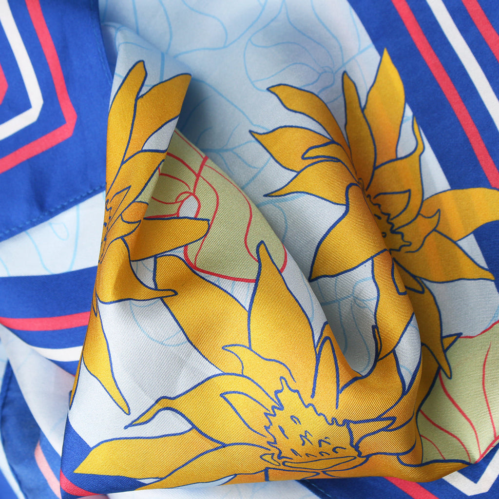 Scarf in hand-rolled silk with Aragüaney Azul Design. 100% Silk, Hand Illustrated by Alesia Nava.